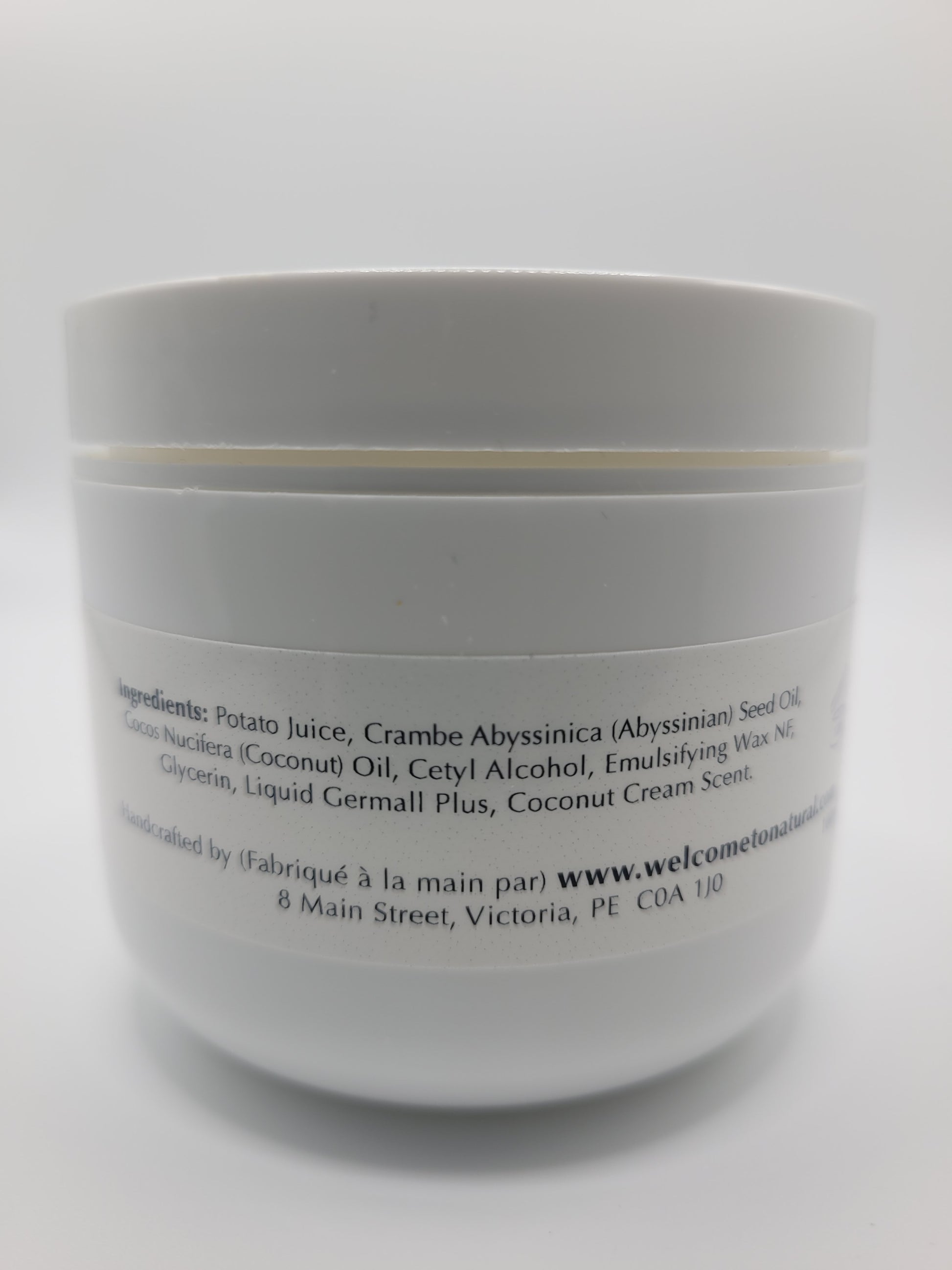 Ingredients: Potato Juice, Crambe Abyssinica Seed Oil, Coconut Oil, Cetyl Alcohol, Emulsifying Wax NF, Glycerin, Liquid Germall Plus, Coconut Cream Scent.